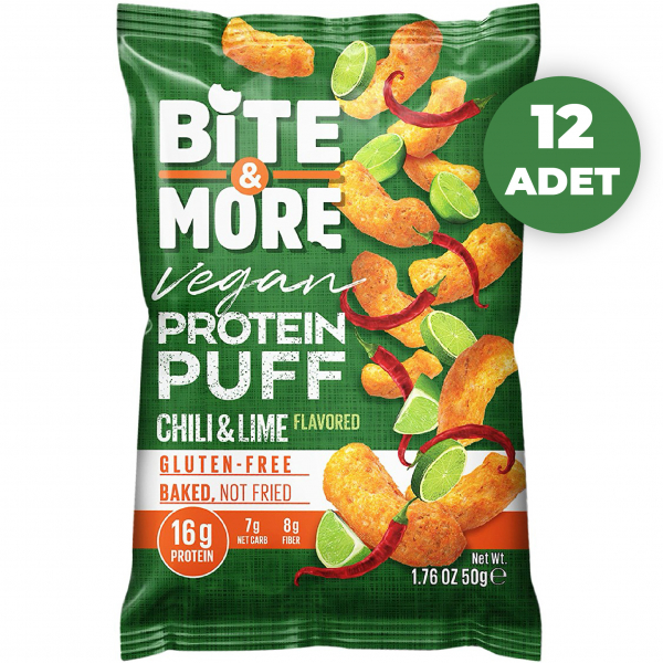 Bite & More Acı Biber ve Limonlu Vegan Protein Puff, her porsiyonda 16g protein, 8g lif ve sadece 8g net karbonhidrat içerir. Vegan, glutensiz ve koruyucu içermeyen formülü ile bilinçli beslenenler için ideal bir seçimdir. Baharatlı acılık ve ferah lime lezzetinin dengeli uyumu, klasik cipslere sağlıklı bir alternatif arayanlar için geliştirilmiştir. Yüksek protein ve lif içeriği sayesinde hem tok tutar hem de gün boyunca enerjinizi dengede tutmanıza yardımcı olur.