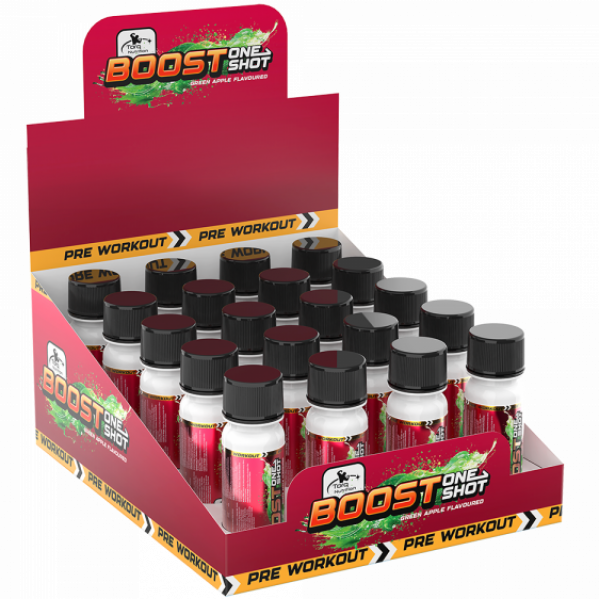 Torq Nutrition BOOST One Shot; Beta Alanin, L-Arjinin, Sitrulin Malat, Taurin, Kafein, Tirozin ve doğal ekstraktlar içeren yeni nesil Pre-Workout ürünüdür. Yüksek Beta Alanin ve L-Arjinin içeriğiyle formüle edilen BOOST One Shot, etkili bir antrenman öncesi desteği sunmak üzere tasarlanmıştır.